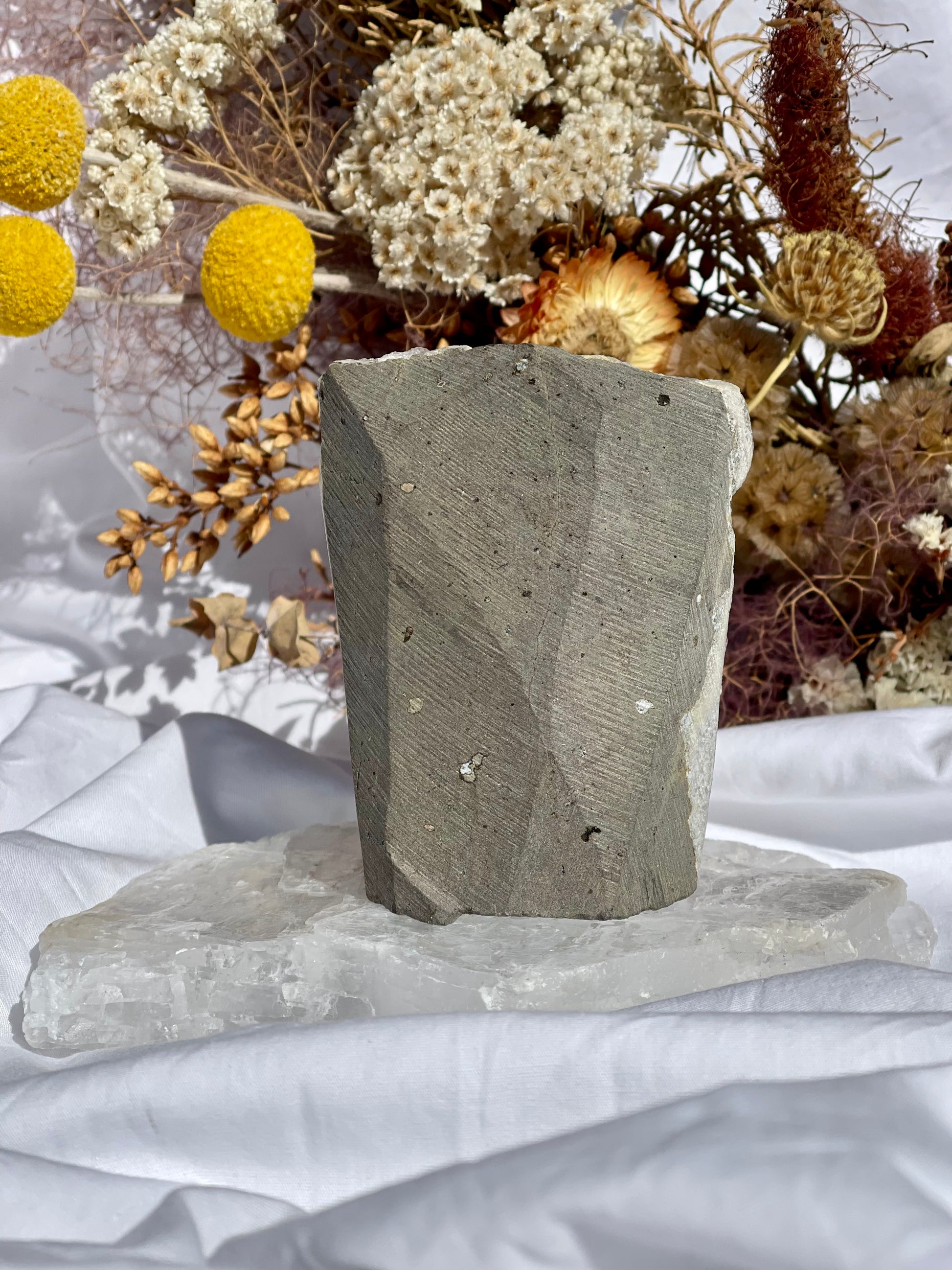 A beautiful inclusion of White Calcite adds a soft uplifting vibration to lighten the spirit and brighten your outlook.