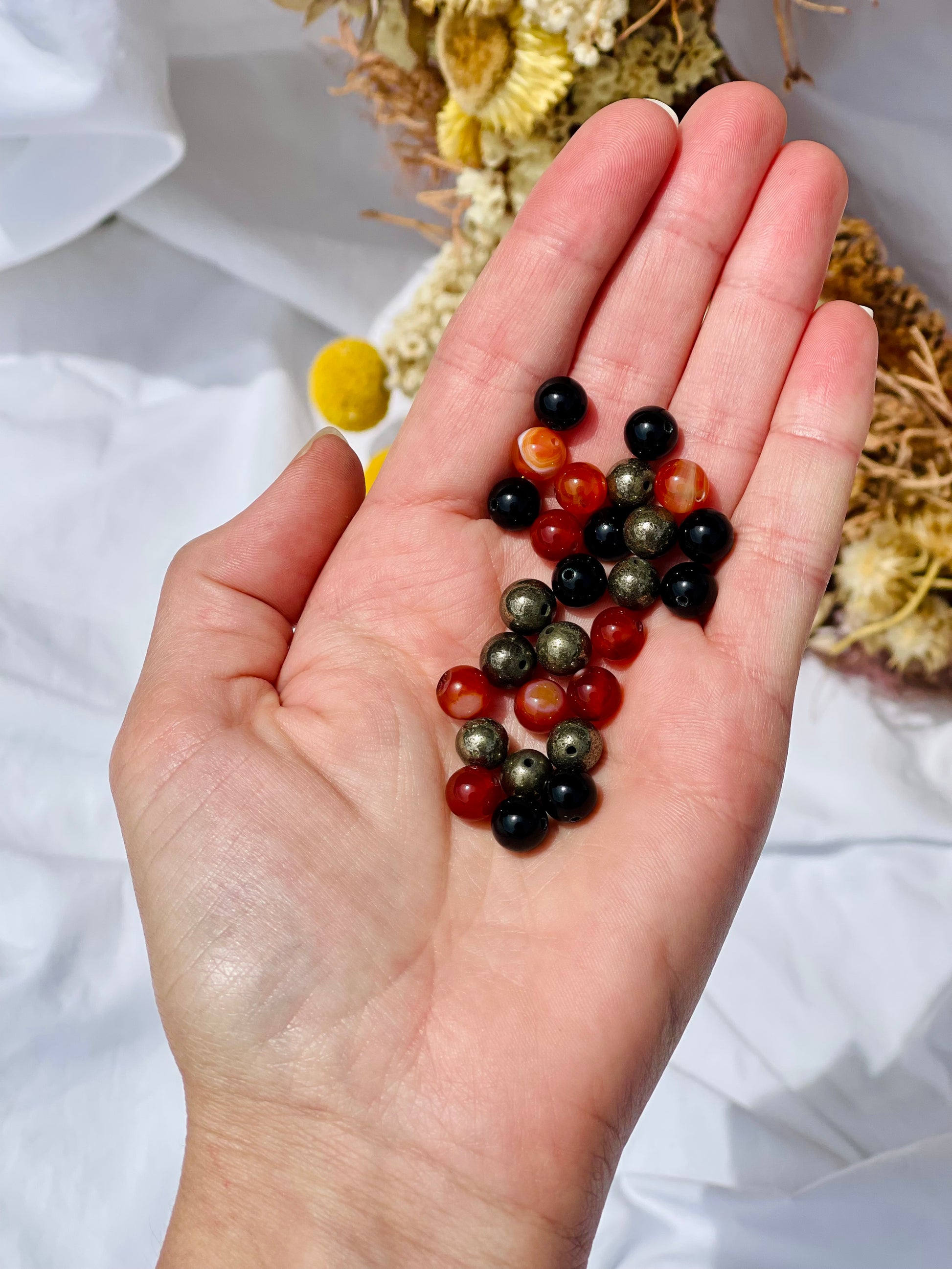 - Beads | A selection of 8mm Black Obsidian, Pyrite and Carnelian genuine crystal beads. Enough beads to create a bracelet up to 22cm in length.